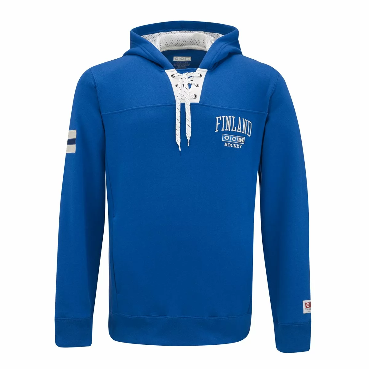 Hood från CCM med Finland-design. Klassiska detaljer som skridskosnören vid halsen och CCM-logga i retrodesign. Mudd nertill och i ärmslut.