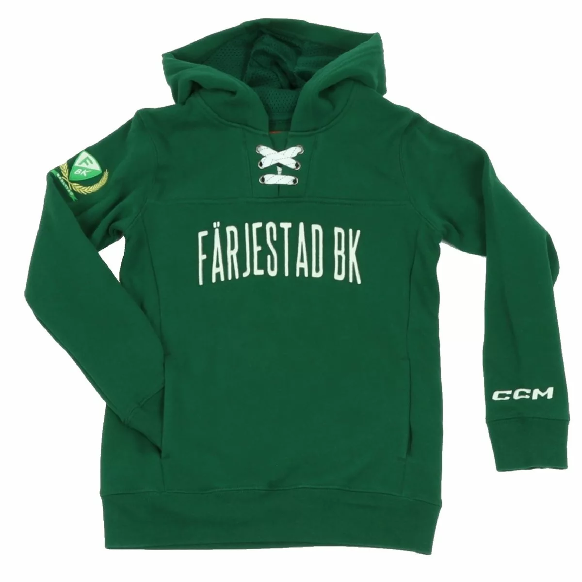 Hoodie från CCM i unikt Färjestad BK utförande. Klubbens gröna färger med Färjestad BK textat i vitt på bröstet. FBK-logo på höger arm som extra detalj. Hockeysnören i kragens mynning.