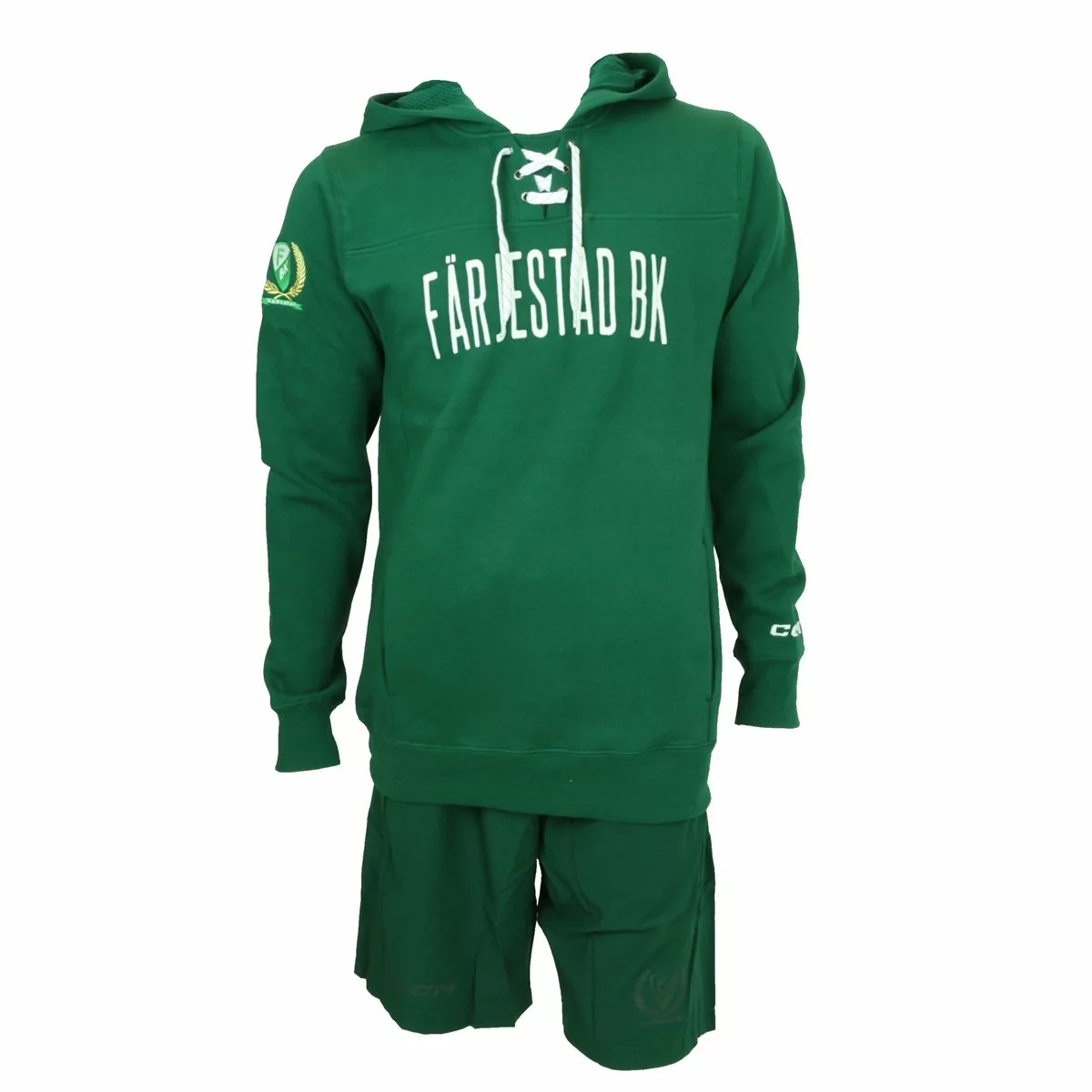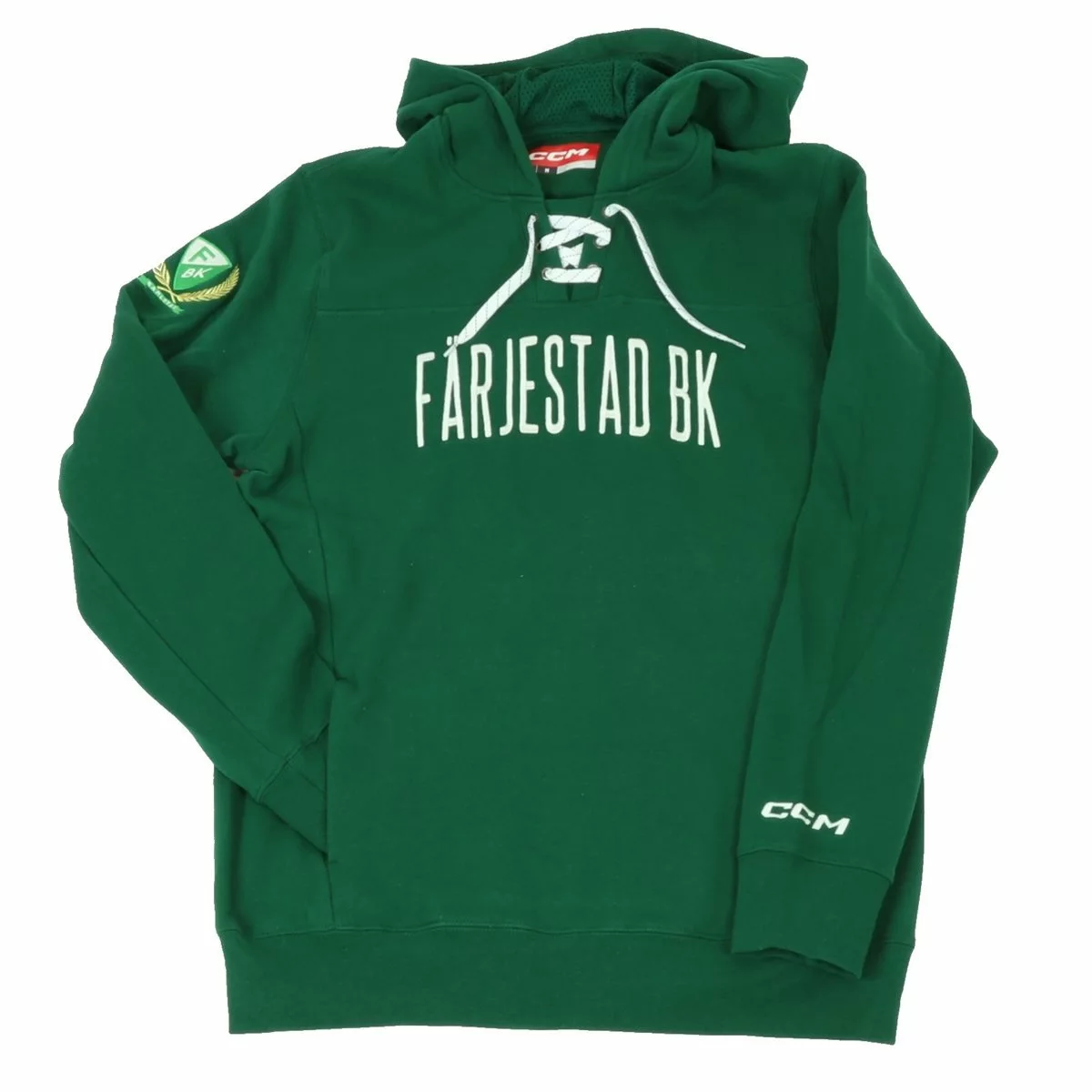 Hoodie från CCM i unikt Färjestad BK utförande. Klubbens gröna färger med Färjestad BK textat i vitt på bröstet. FBK-logo på höger arm som extra detalj. Hockeysnören i kragens mynning.