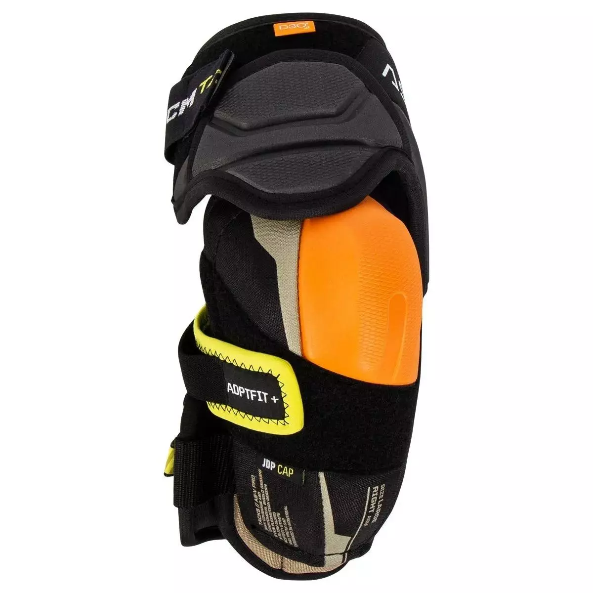 Till konstruktionen av Tacks AS-V Pro, har CCM en ny anatomisk skölddesign med maximal täckning och en 2-delad Flexmotion-konstruktion. ASD sätter skyddet i främsta rummet, ger ultrakomfort och en anpassningsbar passform. ASD är konstruerad för att erbjuda en stor täckningsnivå som följer kroppens naturliga form samtidigt som den tillåter maximalt skydd utan att offra rörlighet. På toppen av Tacks AS-V Pro kommer ett 2-delat flytande ledat och förstärkt komprimerat gjutet Eva-skumbicepsskydd och sublimerad liner. Denna Flexmotion bicepskonstruktion erbjuder skydd på proffsnivå och överlägsen komfort och passform. Strax under bicepsskyddet sitter den JDP-förstärkta armbågskåpan med D30 in- och utsida. Denna Pro-level armbågskåpa är designad för att sprida slagkraften bort från armbågen medan D30 absorberar stötar och stötar både inuti och utanför dynan. Tacks AS-V Pro inkluderar ett snedstrecksköld med smart D30-material. Detta formsprutade underarmsskydd erbjuder förstklassigt skydd och D30 erbjuder maximal stötdämpning hela vägen ner till manschetten på din handske. Ett helt nytt bandsystem håller ihop allt på Tacks AS-V Pro. Adaptfit+-remmarna har en mittlåsrem med dubbla drag plus en 360 graders omslutande underarmsrem. Denna unika dubbla mittremmen drar både från utsidan och insidan för att hålla skyddet där det ska vara. Den främre omlottsremmen säkerställer en åtsittande passform. Detta håller armbågsskydden nära kroppen för att säkerställa att de stannar på plats och ger maximalt skydd.