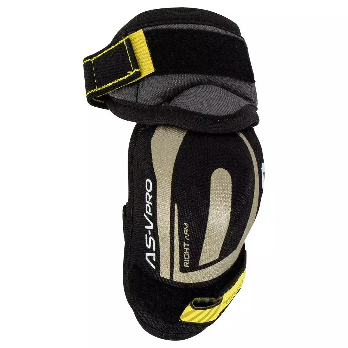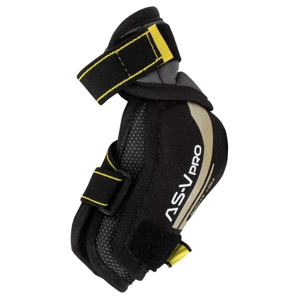 Med början på toppen av Tacks AS-V Pro, gick CCM med en ledad biceps med PE-skum. Denna konstruktion ger spelare stor komfort och skydd i bicepsområdet. Strax under bicepsskyddet finns den JDP-förstärkta armbågskåpan. Denna lätta, Pro-level konstruktion hjälper till att sprida kraften från direkta stötar bort från armbågslederna. Dessutom inkorporerade CCM deras högt ansedda D30 Smart Material för att hjälpa till att absorbera stötar för att ge unga spelare skydd på elitnivå. Tacks AS-V Pro har CCM:s dubbla remjusteringssystem. Detta system har en maximerad landningszon med kardborreband och håller dina armbågsskydd på plats och ger maximalt skydd.