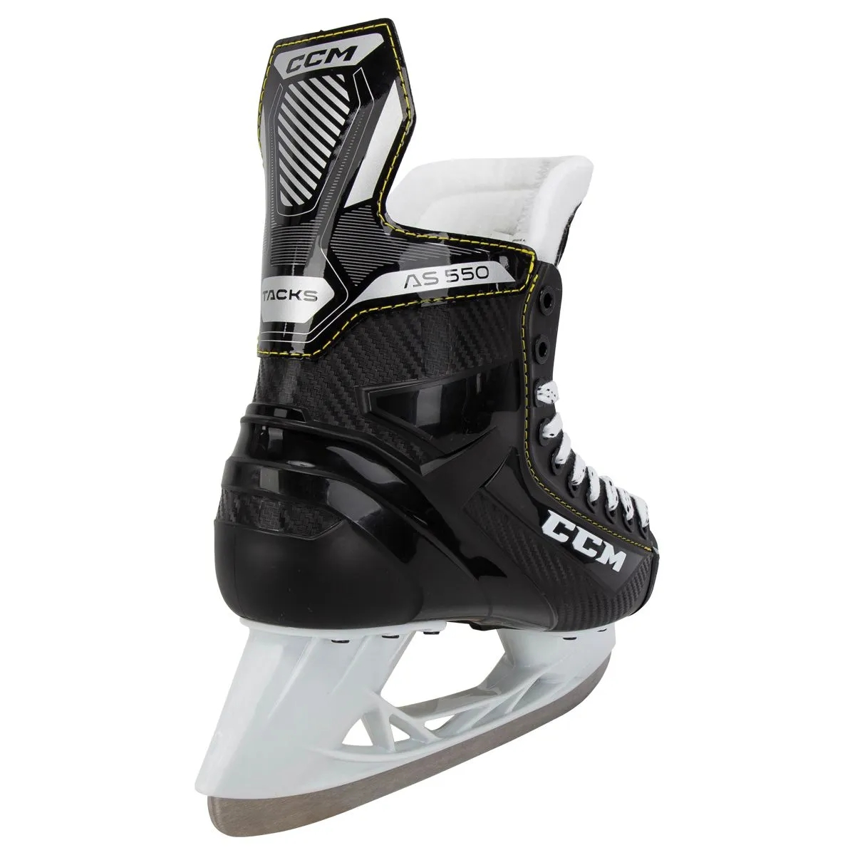 Tacks 550 har CCMs 3D-injicerade känga. Denna stövel är ett ergonomiskt stövelformningssystem för stor komfort och har en ny texturerad finish för förbättrad hållbarhet. Det blir en styvhet på 115 vilket är en solid kärna för bra skridskoprestanda. På framsidan av Tacks 550 finns en filtplös. Denna 5 mm plös har skum för komfort och skydd. Insidan av Tacks 550 har vissa komfort- och hållbarhetshöjande funktioner. HD-mikrofiberfodret är ett fukttransporterande material med hög motståndskraft som hjälper till att transportera bort fukt från kroppen och håller fötterna torra.