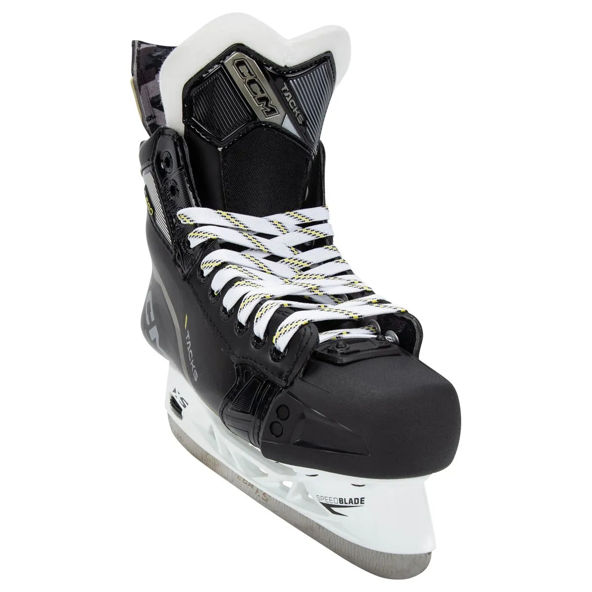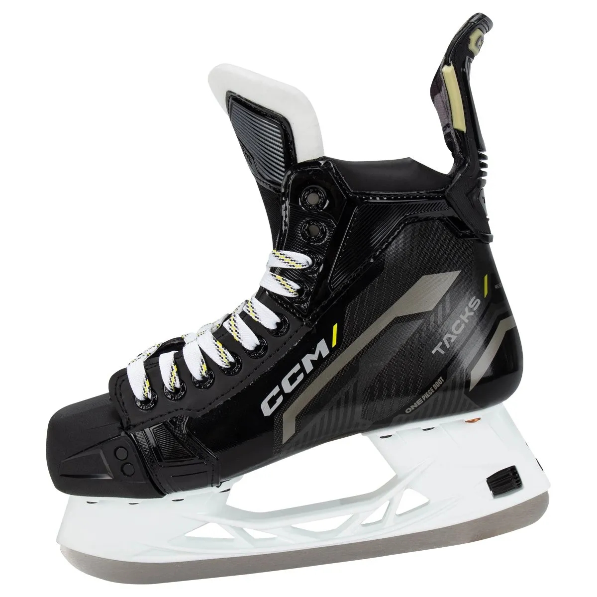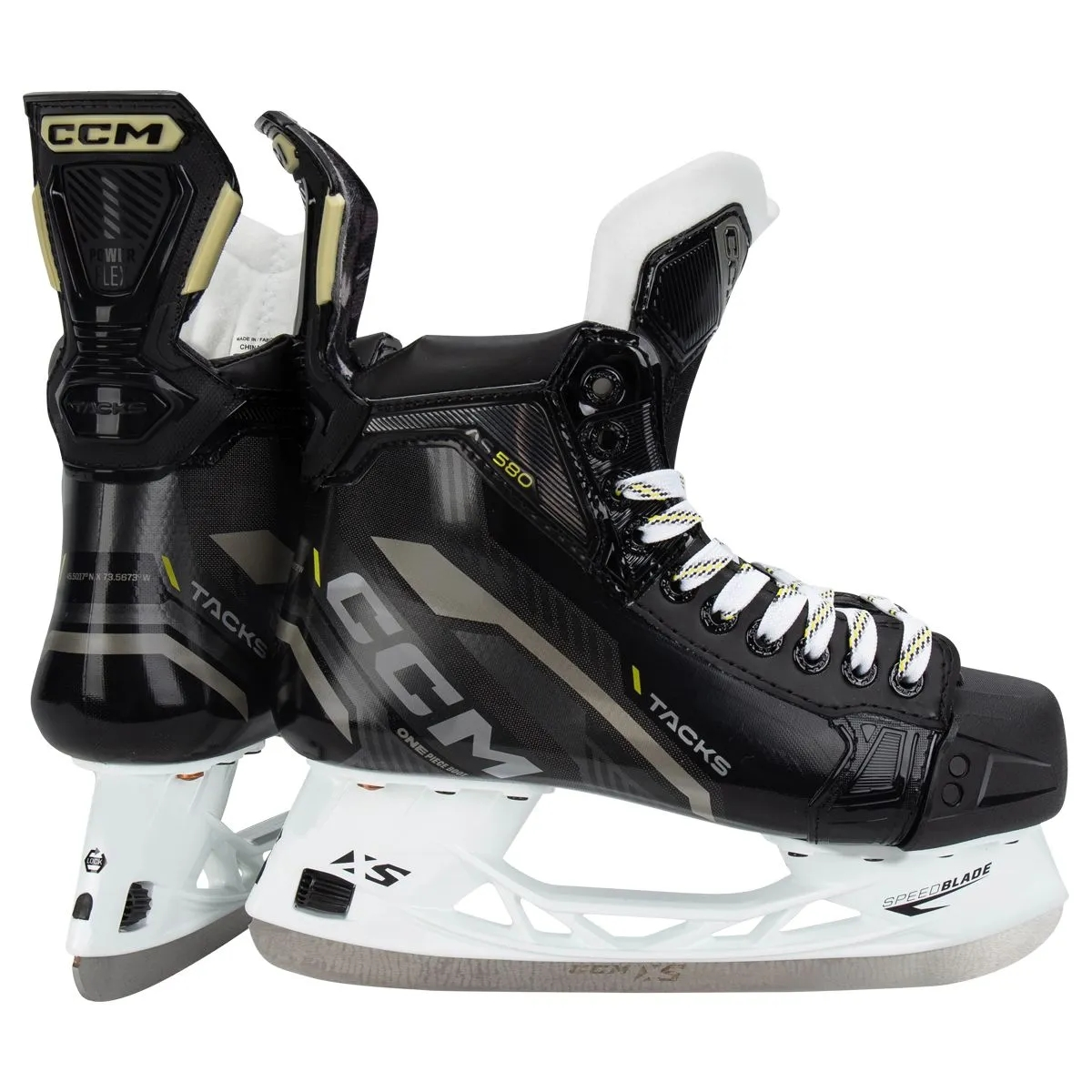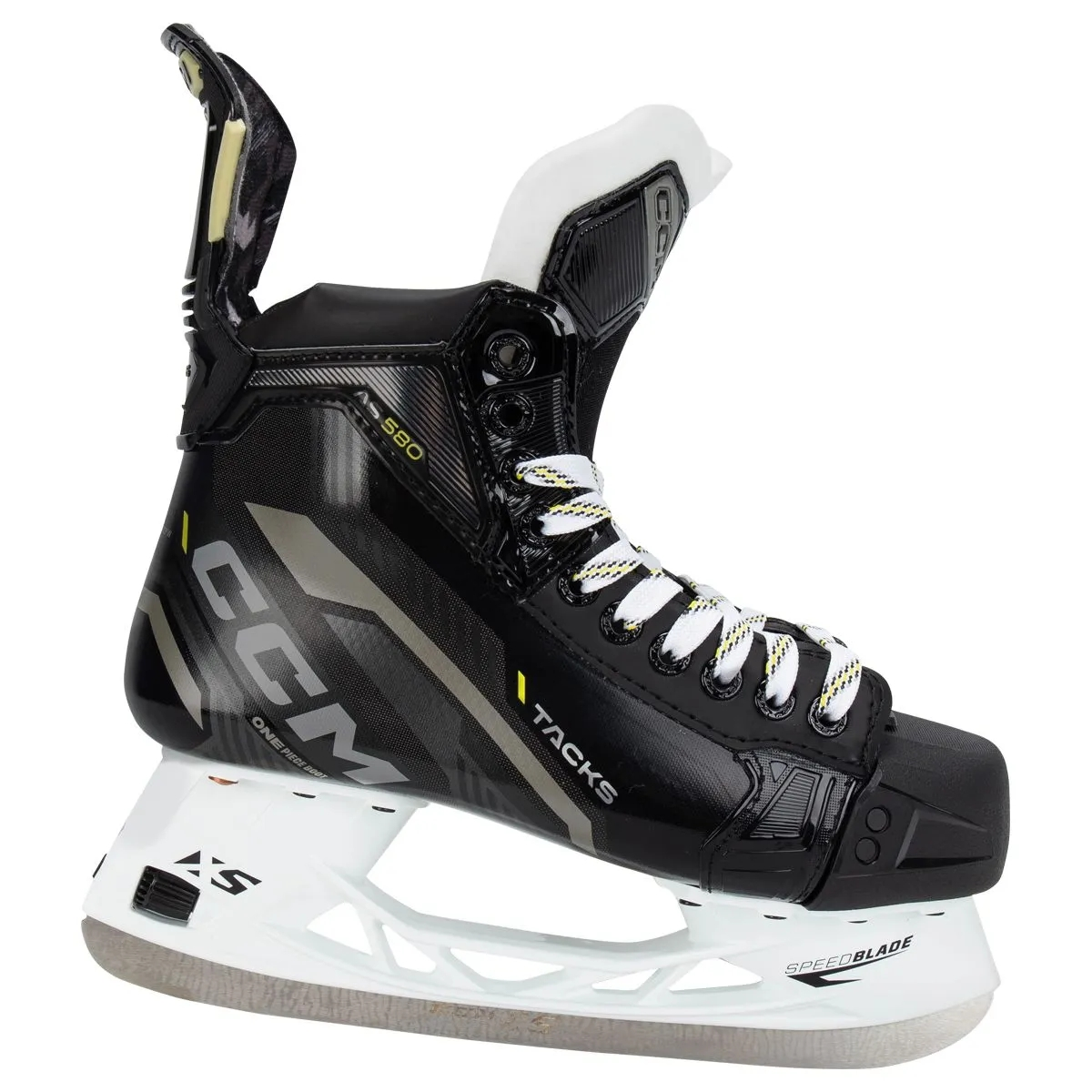 Tacks 580 har en anatomisk passform nära foten som spelarna är vana vid med Tacks-linjen. Denna formsydda, 360-graders passform runt framfoten, hälen och ankeln hjälper till att eliminera negativt utrymme i stöveln, vilket möjliggör effektivare energiöverföring vilket innebär förbättrad hastighet och smidighet. Tacks 580-skridskorna använder CCMs stövelteknologi i ett stycke. Denna stövel hjälper spelare att få mer direkt energiöverföring och en närmare passform för de mest kraftfulla stegen som möjligt. Denna stövel i ett stycke är byggd med RFM-kompositblandning. Denna lätta kompositblandning av NHL-kaliber ger extra hållbarhet. Det har en styvhet på 170 som är lätt och termoformbar för en fantastisk skridskoprestanda. På framsidan av 580 finns CCMs utbytbara asymmetriska plös. Denna 7 mm plös har förstärkta lager för ökad komfort och skydd. Insidan av Tacks 580 är laddad med komfort och hållbarhetsförbättrande funktioner. HD-mikrofiberfodret är ett fukttransporterande material med hög motståndskraft som hjälper till att transportera bort fukt från fötterna och håller dem torra och lätta. Det invändiga multi-density memory-skummet i ankelområdena lindar anatomiskt runt spelarnas anklar. På baksidan av skridsko, Powerflex senskydd, ger förbättrat rörelseomfång för fylligare steg och ökad kraft. För fotbädden använder CCM sin Ortholite-sula. Detta erbjuder förstklassig komfort och stöd med återvunnet EVA-skum. Till den nedre halvan av Tacks 580-skridskorna använder CCM deras populära SpeedBlade XS-hållare. Dessa hållare utvecklades som ett snabbt och enkelt sätt för spelare att byta ut stål i farten, samtidigt som de säkerställer en konsekvent känsla varje gång. Hållarna använder en positiv låsmekanism som tätt fäster löparna vid hållaren för att förhindra att bladet lossnar under spelet. Tillsammans med SpeedBlade XS-hållaren finns XS-skenorna i rostfritt stål. Dessa stål ger en långvarig fördel för långsiktig prestation.