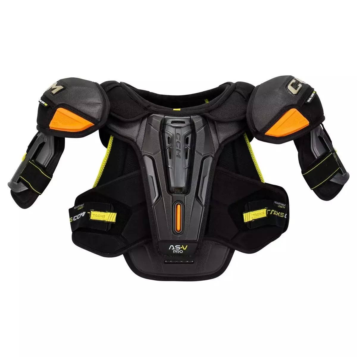 Till konstruktionen av Tacks AS-V Pro, har CCM en ny anatomisk design med maximal täckning. ASD sätter skyddet i främsta rummet, ger ultrakomfort och en anpassningsbar passform. ASD är konstruerad för att erbjuda skydd av högsta kvalitet. Tillsammans med en Flexmotion design, som erbjuder en överlägsen komfort med extra revbensskydd och längdjusterbara bålremmar för att underlätta att hitta din perfekta passform. Tacks AS-V Pro erbjuder elitskydd och rörlighet. Till axlarna på Tacks AS-V Pro, är kåporna konstruerade med ett dubbelkärnigt HD-skum med exponerade skumskydd plus D30 Aero. Detta förbättrade skydd på proffsnivå med D30 på den yttre kåpan, hjälper till att absorbera och fördela de tuffaste stötarna från alla vinklar. Ner från axlarna kommer bicepsen att ha Adaptfit+-remmar med höjdjusterbart bicepsskydd. Detta möjliggör en anpassad passform för att överbrygga gapet mellan skulder- och armbågsskydd, för maximal täckning och skydd på elitnivå. Dessutom har CCM förstärkta flytande bågar för nyckelben och skulderbladsskydd. Detta är designat för optimal rörlighet och komfort. En av de viktigaste skyddande delarna av AS-V Pro är bröstbenet och ryggradens skydd. CCM använder Vent-Tech flytande bröstbens- och ryggradshybridsköldar med D30 Smart material i plexus och nedre ryggraden. Till mittsektionen har CCM inkluderat andningsbara och justerbara extra kuddar för magen och nedre delen av ryggen. Dessa utökar ditt skydd och förbättrar interaktionen med dina hockeybyxor. Njurskyddet i HD-skum ger spelare ännu mer komfort och skydd för de känsliga njurområdena, vilket säkerställer att alla delar av din överkropp är väl täckta och skyddade. På insidan av Tacks AS-V Pro har CCM lagt till ett sublimerat foder plus mjuka dubbellagers stretchpaneler. Detta komfortfoder av överlägsen kvalitet rör sig med dig och håller skyddet där det ska vara. Denna design är gjord för att maximera luftflödet och rörligheten för att hålla spelaren torr och sval.