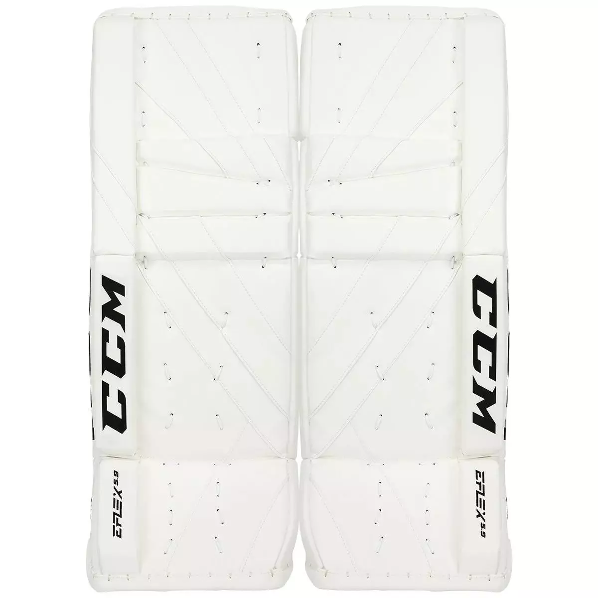 Grafiken för E5.9 har CCM syftat till att ge ett brett utbud av variationer i hela grafiken med skärande zoner strategiskt placerade för att uppnå unik design som både enkla och komplexa. I likhet med A1.9-linjen innehåller E5.9 specialzoner med alla de nya UV-tryckta zonerna i den övre innerzonen och den nedre yttre zonen. Dessa zoner gör att dynan kan höjas visuellt genom att lägga till den lilla extra kryddan. CCM’s helt nya formade knärullsdesign som är utformad för att skapa stabilitet genom knäområdet och samtidigt uppnå kontrollerbara returer runt dynans knäområdet. Den gjutna knärullen går hand i hand med dynans visuella design, vilket ger målvakten möjlighet att integrera eller bryta motivet. I hela E5.9 hittar du CCM’s ”SpeedSkin” stämplade material som skapar en ny nivå för stil och funktion. CCM E5.9 har Dual1teCore-teknik som främjar vridning för att maximera rörelsen på målvaktens fötter och arbetar med den styva lårhöjningen för att skapa en bättre och mer konsekvent tätning på isen. Ytan har traditionella högdensitetsskum som hjälper till att dämpa returer. Knät är utformat med ett 3D Grip/PE-skum med upphöjda inre kantstabilisatorer för utmärkt tätning och maximal stötabsorbering.