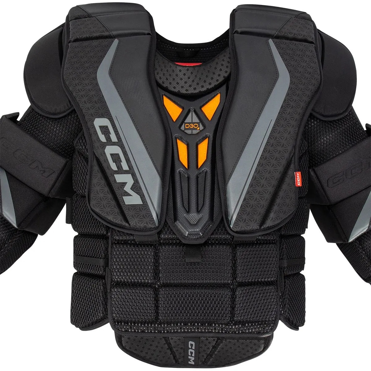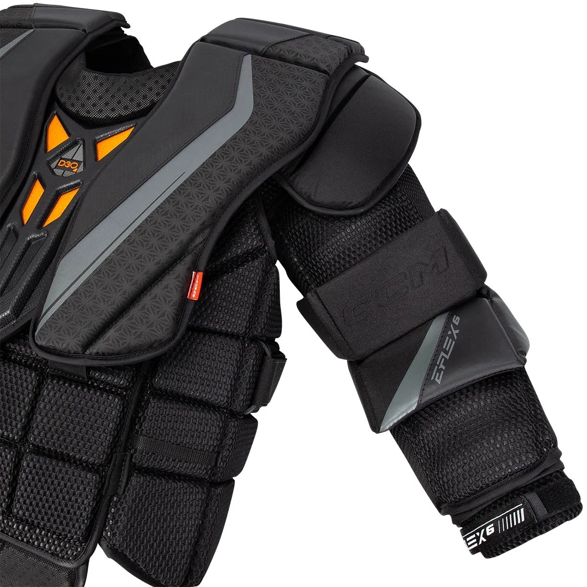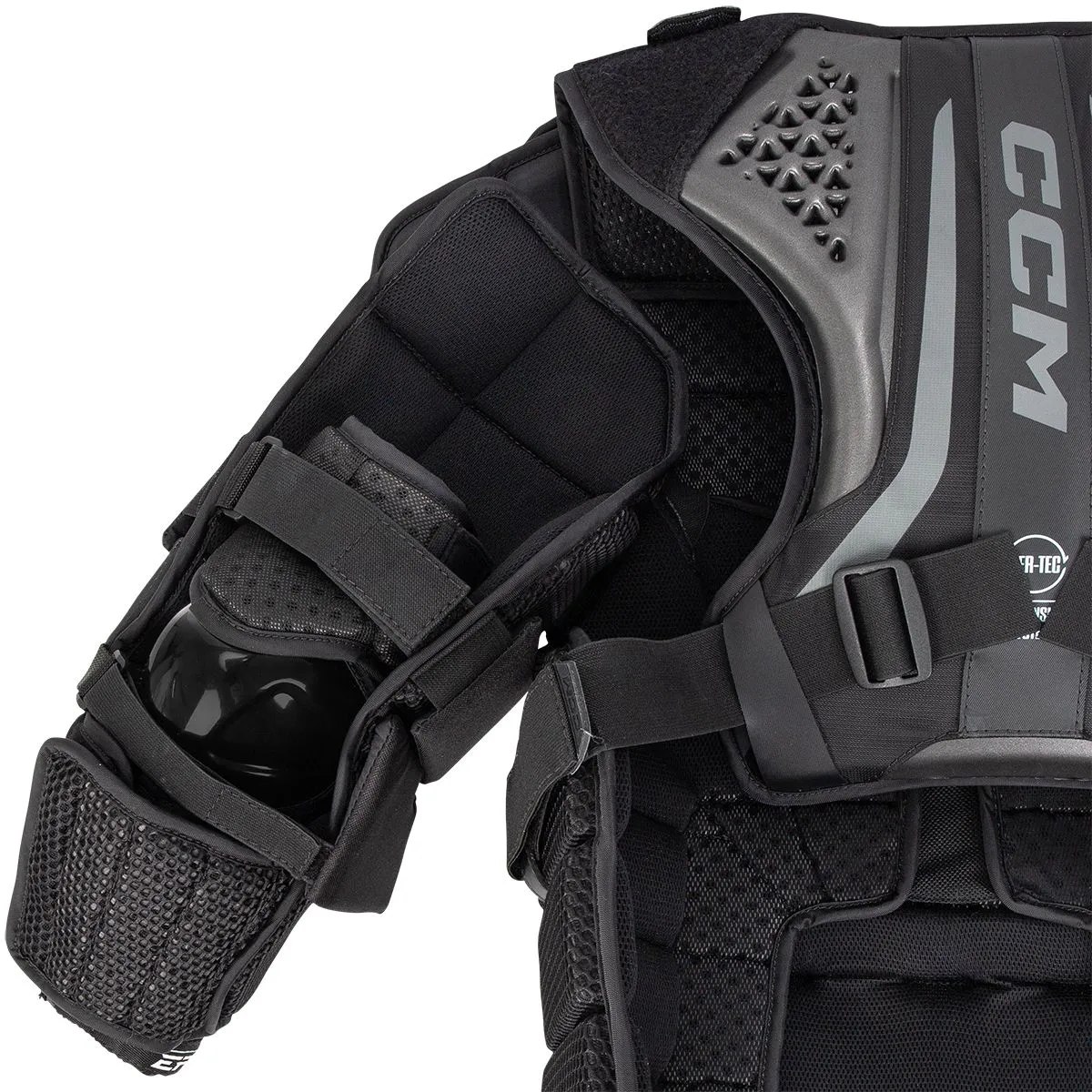 Axlarna erbjuder kompressionsgjutna axelkåpor i HD-skum optimerat skydd, medan flyttopparna har snabba kardborrejusteringar med en flexibel rörelsedesign, för en enkel anpassad passform som rör sig med målvakten. Gjuten HD-skum med D3O finns i bröstbenet för maximalt stötskydd, medan bröstet och revbenen har multisegmenterade HD/LD-ventilerade skum för optimerat och utökat skydd och täckning med extra andningsförmåga och rörlighet. Allt detta kompletteras av ett Aer-Tec ventilationssystem som består av perforerat skum och nötningsbeständigt nät för att maximera andningsförmågan. Kompressionsgjutet HD Zote-skum i biceps och underarm ger överlägset skydd och rörlighet. Vid armbågen erbjuder en oberoende justerbar design med en kåpa med komfortpassform en personlig passform och oöverträffad rörlighet. Bakplattan har CCMs helt nya Air-Tec upphängningssystem vilket erbjuder optimalt luftflöde och andningsförmåga med extra skydd över ryggraden.