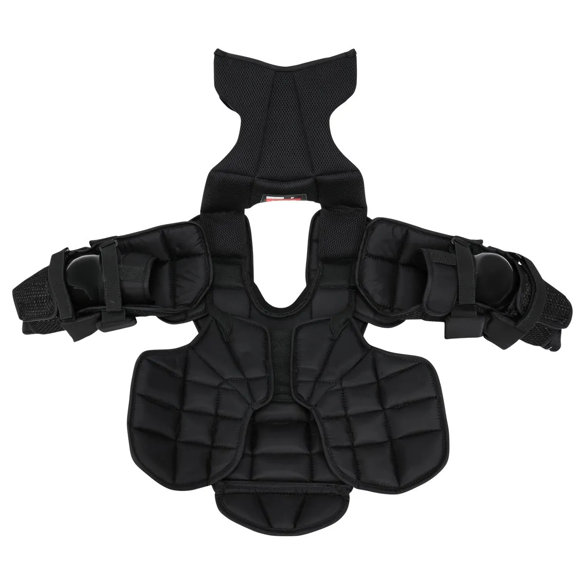 Kompressionsgjutna axelkåpor i PE-skum erbjuder optimerat skydd, medan flyttopparna har snabba kardborrejusteringar med en flexibel rörelsedesign, för en enkel anpassad passform som rör sig med målvakten. PE-skum finns i bröstbenet för förbättrat slagskydd, medan bröstet och revbenen har utökat skydd och täckning med extra andningsförmåga och rörlighet. PE-skum i biceps och underarm ger bättre skydd och rörlighet. Vid armbågen erbjuder en oberoende justerbar design med en kåpa en personlig passform och oöverträffad rörlighet.