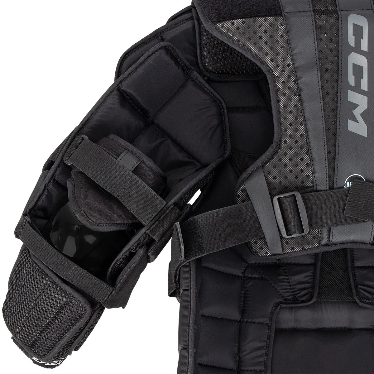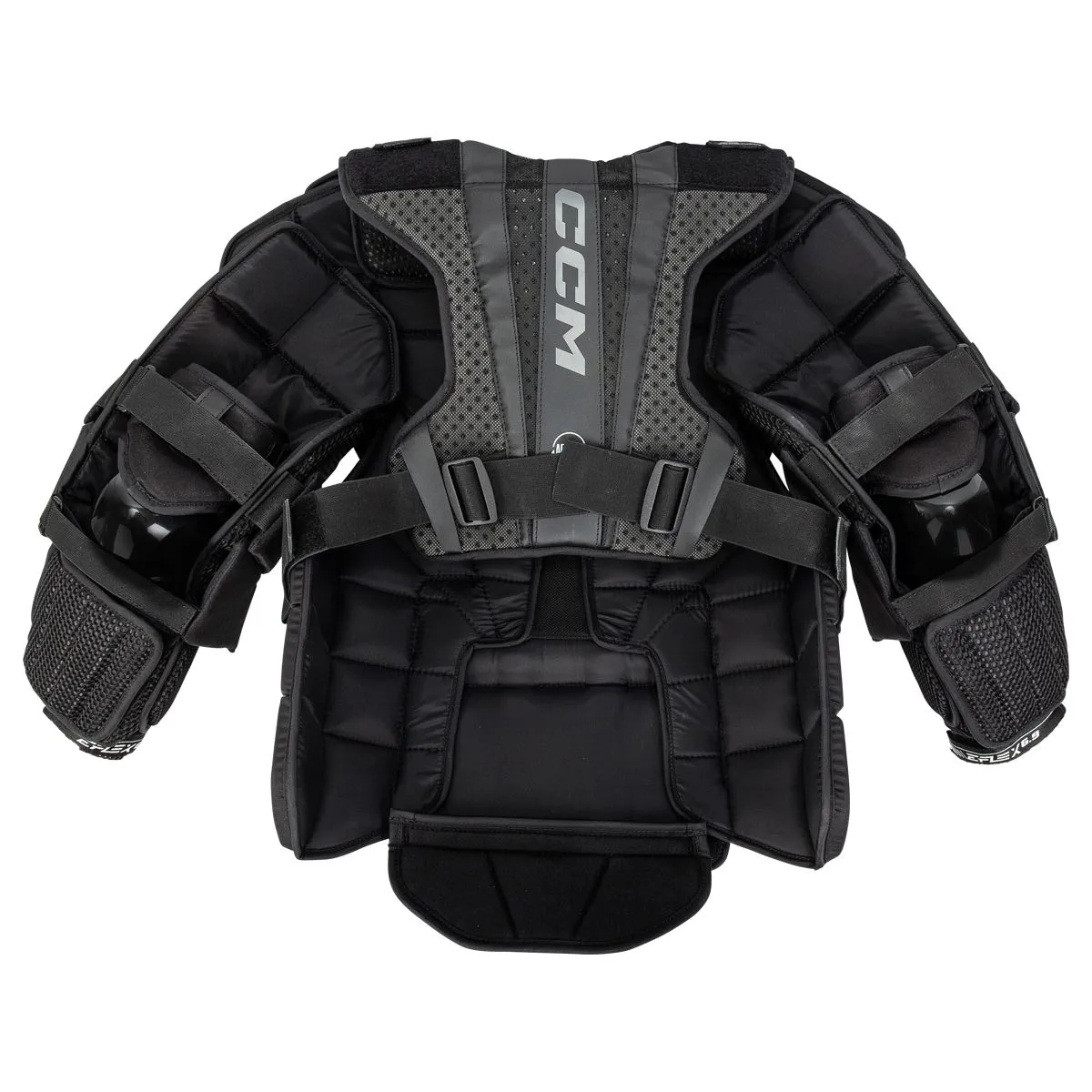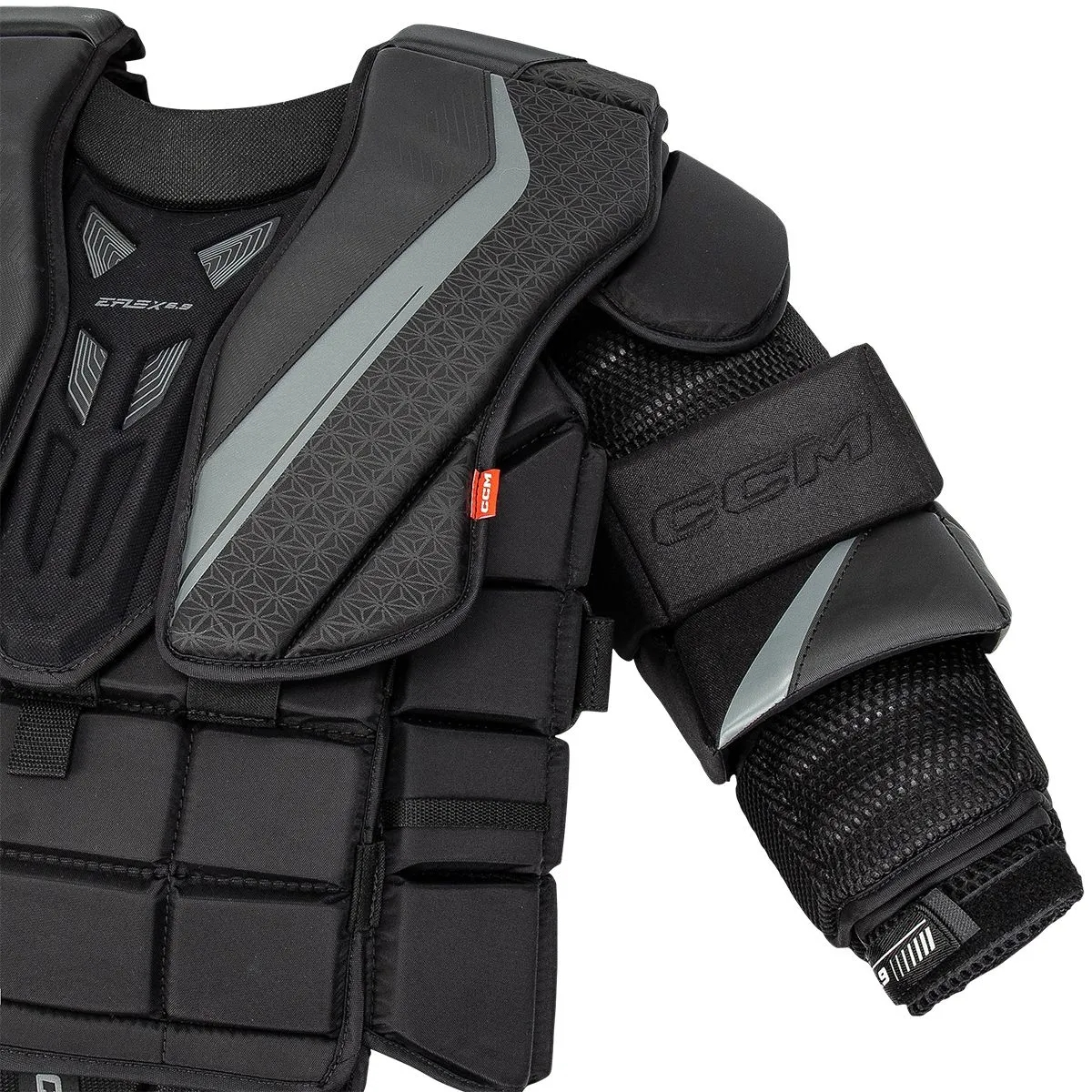 Axlarna erbjuder kompressionsgjutna axelkåpor i HD-skum optimerat skydd, medan flyttopparna har snabba kardborrejusteringar med en flexibel rörelsedesign, för en enkel anpassad passform som rör sig med målvakten. Gjuten HD-skum finns i bröstbenet för förbättrat slagskydd, medan bröstet och revbenen har multisegmenterade HD/LD-ventilerade skum för optimerat och utökat skydd och täckning med extra andningsförmåga och rörlighet. Allt detta kompletteras av ett Aer-Tec ventilationssystem som består av perforerat skum och nötningsbeständigt nät för att maximera andningsförmågan. Kompressionsgjutet HD-skum i biceps och underarm ger förbättrat skydd och rörlighet. Armbågen har en oberoende justerbar design med en kåpa med komfortpassform en personlig passform och oöverträffad rörlighet. Bakplattan har CCMs helt nya Air-Tec ventilationssystem erbjuder optimalt luftflöde och andningsförmåga.
