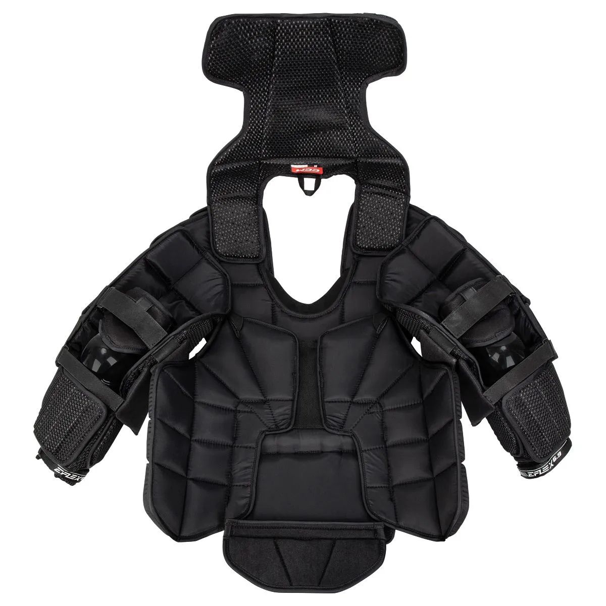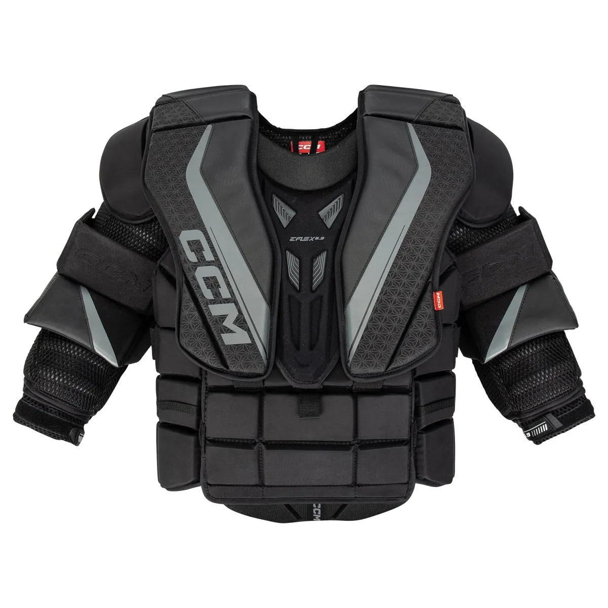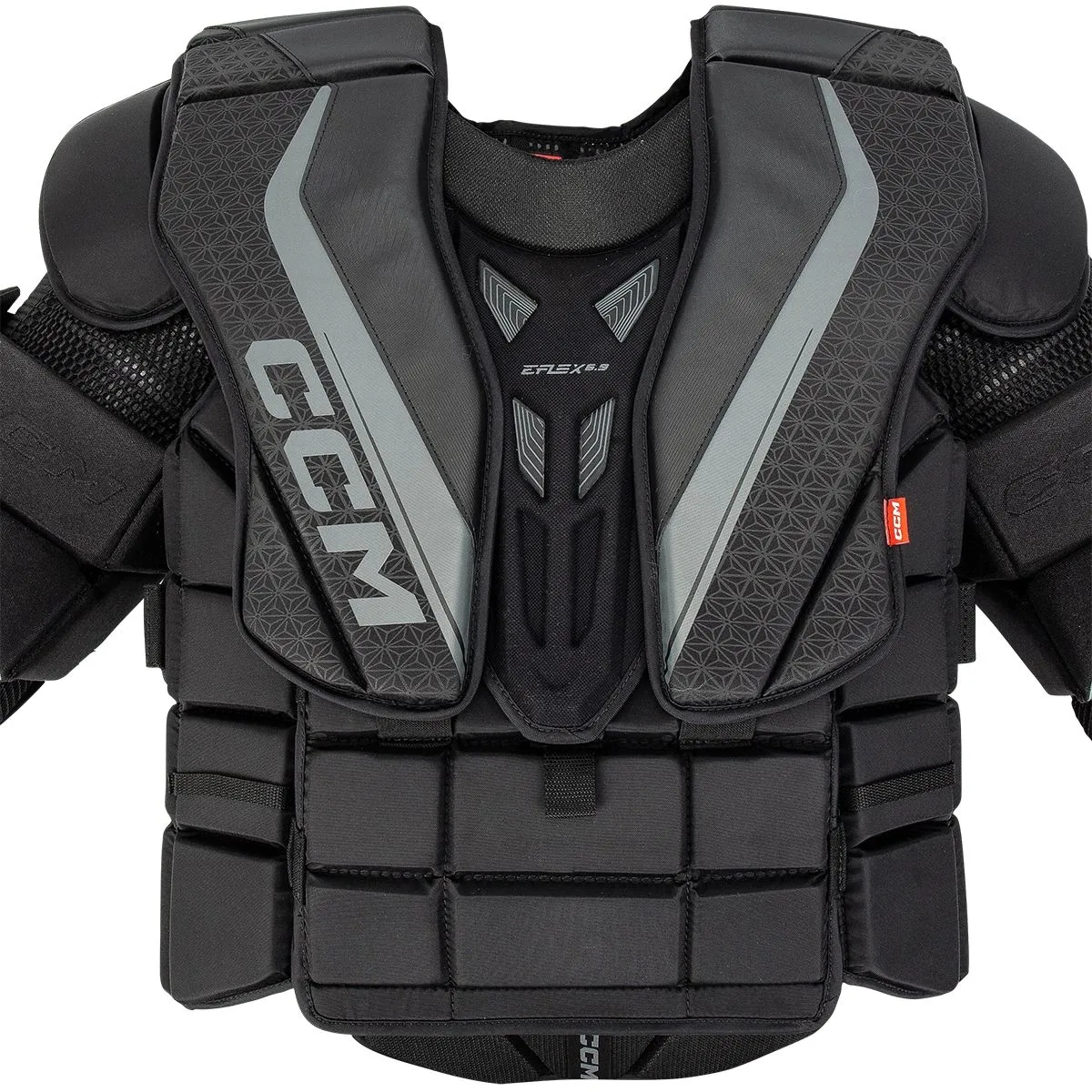 Axlarna erbjuder kompressionsgjutna axelkåpor i HD-skum optimerat skydd, medan flyttopparna har snabba kardborrejusteringar med en flexibel rörelsedesign, för en enkel anpassad passform som rör sig med målvakten. Gjuten HD-skum finns i bröstbenet för förbättrat slagskydd, medan bröstet och revbenen har multisegmenterade HD/LD-ventilerade skum för optimerat och utökat skydd och täckning med extra andningsförmåga och rörlighet. Allt detta kompletteras av ett Aer-Tec ventilationssystem som består av perforerat skum och nötningsbeständigt nät för att maximera andningsförmågan. Kompressionsgjutet HD-skum i biceps och underarm ger förbättrat skydd och rörlighet. Armbågen har en oberoende justerbar design med en kåpa med komfortpassform en personlig passform och oöverträffad rörlighet. Bakplattan har CCMs helt nya Air-Tec ventilationssystem erbjuder optimalt luftflöde och andningsförmåga.