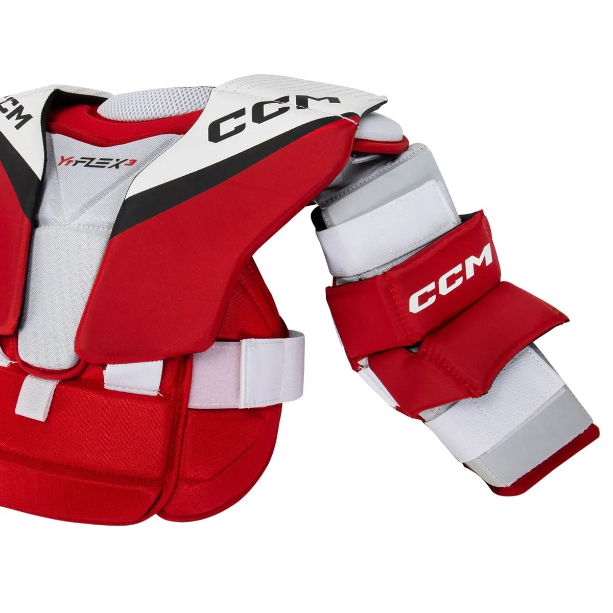 Till bröstet och magen på YTFlex 3 använder CCM genomgående PE-skum för att mjuka upp pucken och ge skydd. En 3-delad konstruktion hjälper målvakten att röra sig samtidigt som den håller kroppen skyddad från alla vinklar. Axlarna har en segmenterad fyrkantig design på vingarna och axelkåporna erbjuder exceptionell täckning och rörlighet. Armarna har flexibelt PE-skum genom biceps och underarmar för att hålla målvakten säker. En anatomisk armbågskupa på baksidan gör att armen sitter naturligt och ger en bra passform.